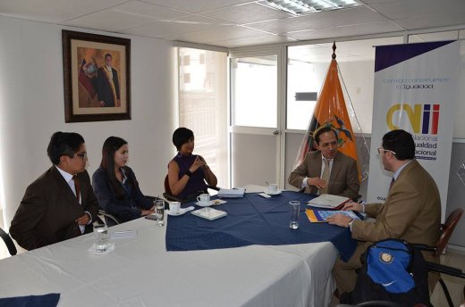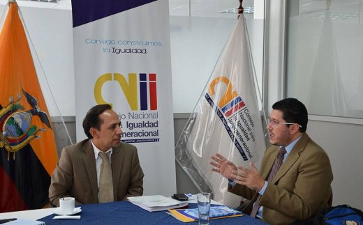 2015-09-29. Reunión con CNII y Ministerio de Justicia, Derechos Humanos y Cultos. El Coordinador Jurídico del IIN, Sr. Esteban de la Torre, sostuvo una reunión con el Secretario Técnico del Consejo Nacional para la Igualdad Intergeneracional, Sr. Francisco Carrión Sánchez y con el Subsecretario de Desarrollo Integral para adolescentes infractores, del Ministerio de Justicia, Derechos Humanos y Cultos, Sr. Xavier Díaz, durante su visita al Estado de Ecuador. Durante este encuentro se analizó la cooperación del IIN-OEA en Ecuador, con la implementación de los cursos que ofrece el ente Interamericano con un formato sin tutoría adicional al formato tutorado que ya dicta. Posteriormente se sostuvo un diálogo sobre la asistencia técnica desarrollada durante 2014 y sobre el modelo de trabajo con adolescentes hallados responsables de un delito de carácter sexual, así como también la posibilidad de generar nuevos procesos de asistencia técnica.